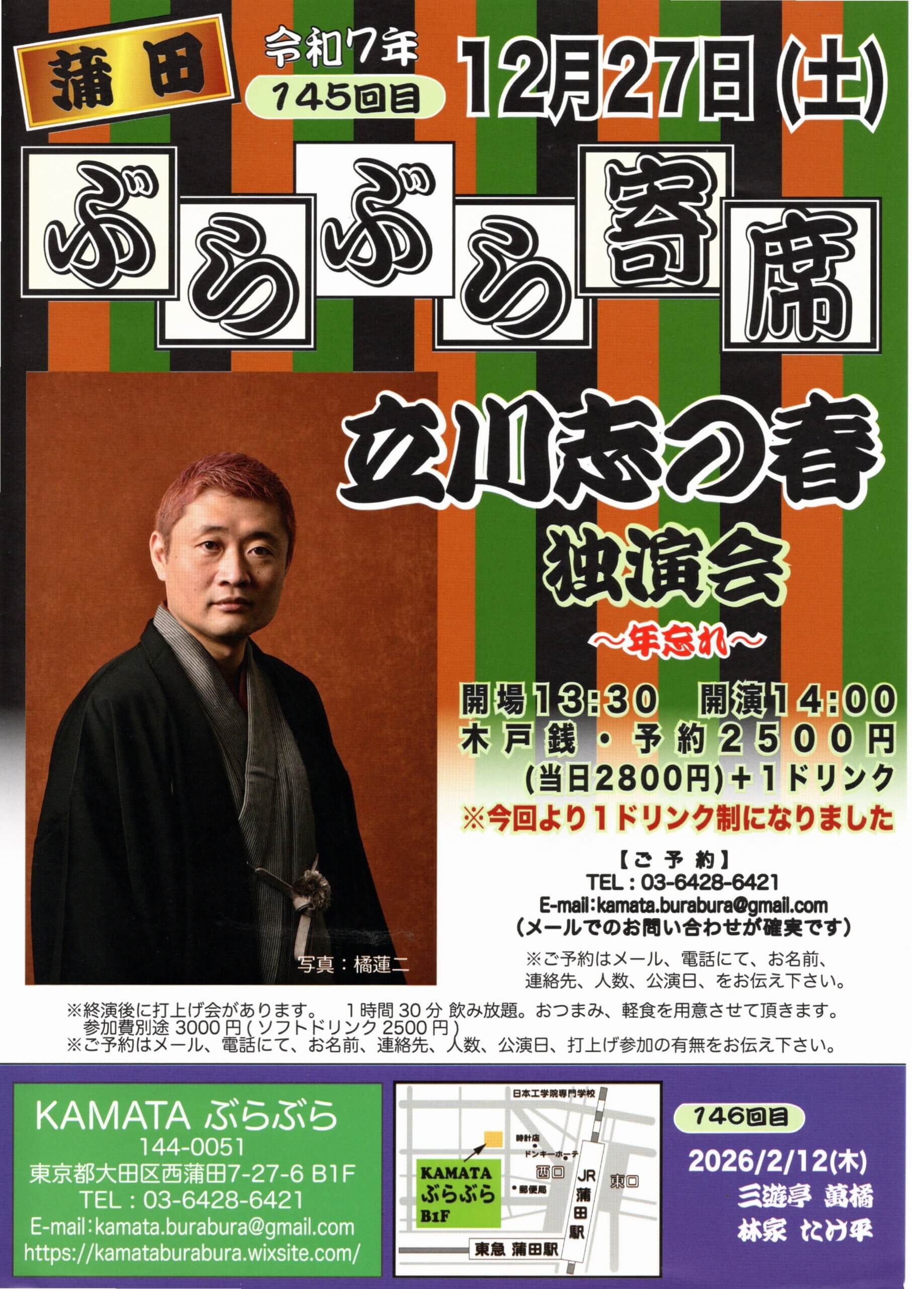 145回目 蒲田ぶらぶら寄席 立川志の春独演会 2025年12月27日 145回目 蒲田ぶらぶら寄席 立川志の春独演会 日付12月27日(土) 場所KAMATAぶらぶら 東京都大田区西蒲田7-27-6 B1F 時間開演14:00(30分前開場) 出演立川志の春 料金予約2,500円(税込)/ 当日2,800円(税込) ※今回より1ドリンク制になりました ※終演後打上げに参加ご希望の場合、別途3,000円(90分間飲み放題、おつまみ、軽食)・ソフトドリンクの場合2,500円 ご予約・お問合せkamata.burabura@gmail.com 又は 03-6428-6421 公演日・お名前・枚数・ご連絡先・打上げ参加有無をお知らせください Tweet Share Hatena Pocket RSS feedly Pin it