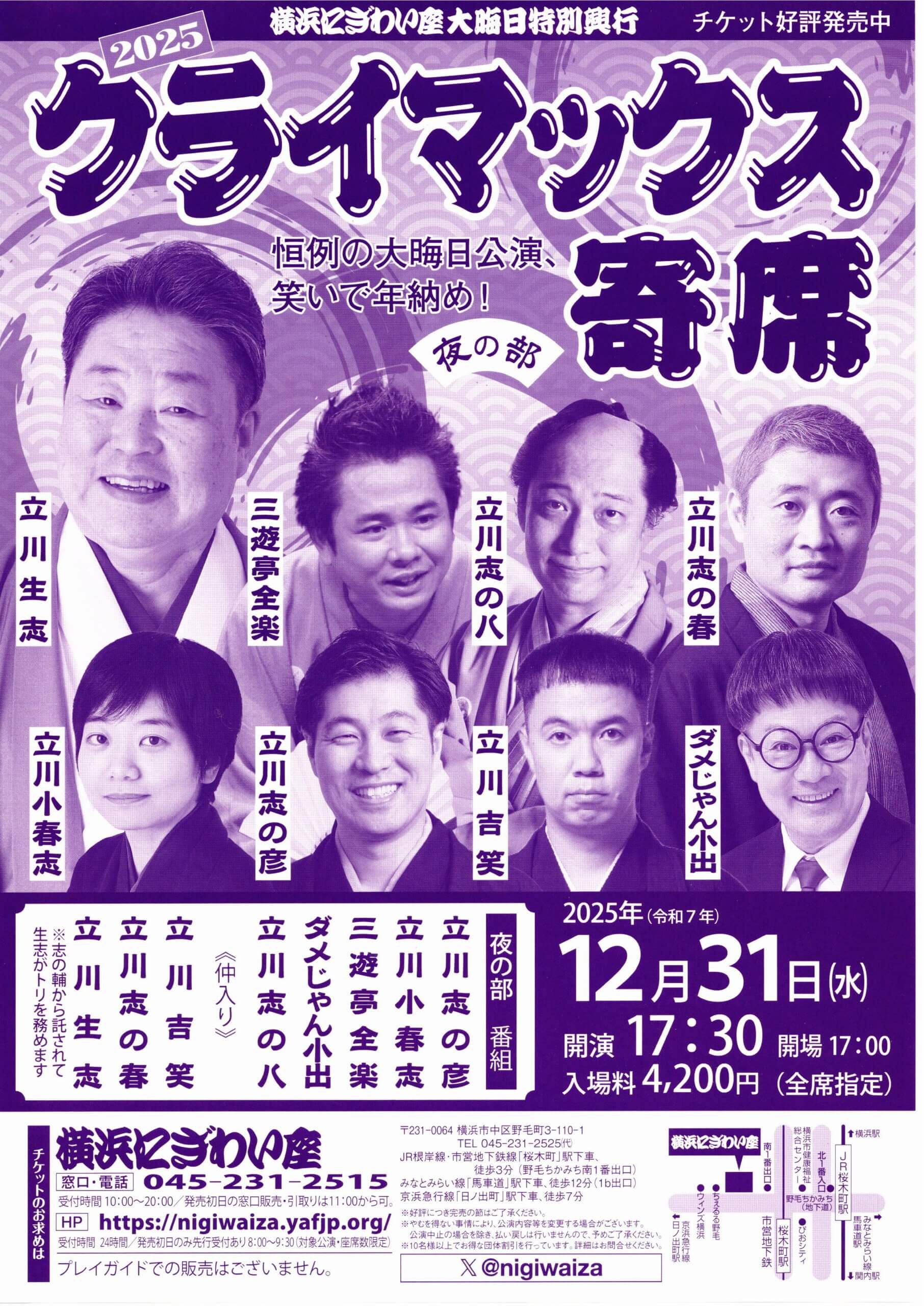横浜にぎわい座大晦日特別興行 2025クライマックス寄席<夜の部> 2025年12月31日 横浜にぎわい座大晦日特別興行 クライマックス寄席<夜の部> 日付12月31日(水) 場所横浜にぎわい座 時間<夜の部> 開演17:30 (開場17:00) 出演・プログラム立川志の彦、立川小春志、三遊亭全楽、ダメじゃん小出、立川志の八 ≪仲入り≫ 立川吉笑、立川志の春、立川生志 料金全席指定 4,000円(税込) ※プレイガイドでの取り扱いはございません 申込方法詳細:https://nigiwaiza.yafjp.org/perform/archives/30699 Tweet Share Hatena Pocket RSS feedly Pin it