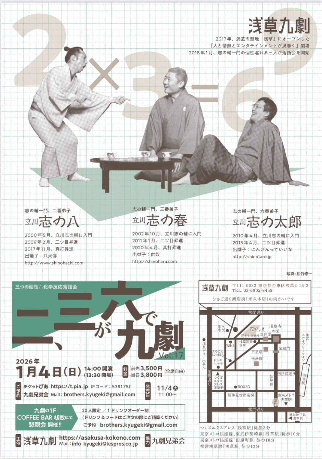 二、三が六で九劇 vol.17 落語と笑いの方程式 2026年1月4日 日付1月4日(日) 場所・浅草九劇 東京都台東区浅草2-16-2 時間14:00〜(開場13:30) 出演立川志の八、立川志の春、立川志の太郎 料金全席自由:前売 3,500円(税込)/ 当日 3,800円(税込) ご予約・お問合せ(11月4日(火)11時~発売開始) ・チケットぴあ(Pコード:538-175) ・九劇兄弟会Mail:brothers.kyugeki@gmail.com (懇親会ご予約もこちらまで) Tweet Share Hatena Pocket RSS feedly Pin it
