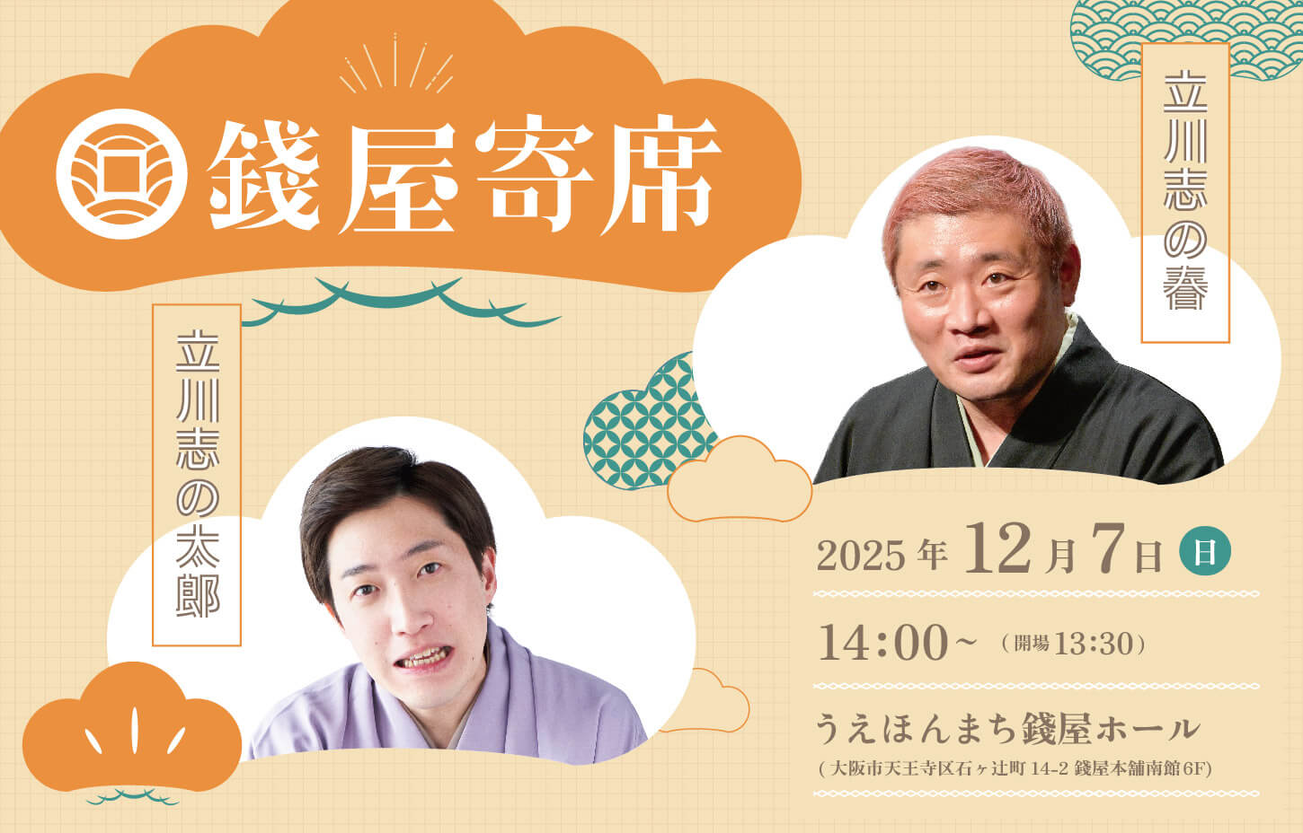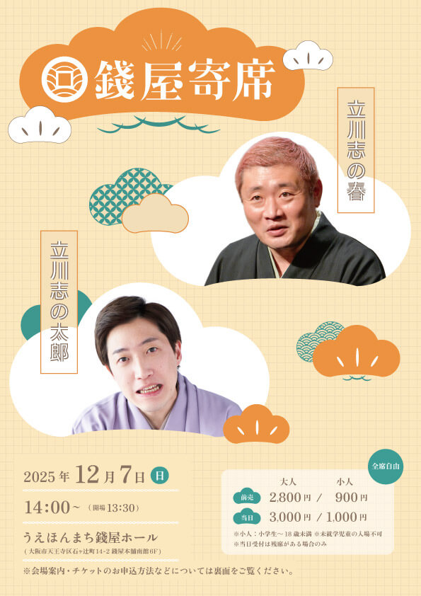 (大阪)錢屋寄席 志の春 志の太郎 2025年12月7日 錢屋寄席 立川志の春 立川志の太郎 日付12月7日(日) 場所うえほんまち錢屋ホール 大阪市天王寺区石ヶ辻町14-2 錢屋本舗南館6階 (大阪上本町駅より徒歩3分、谷町九丁目駅より徒歩10分) 時間開演14:00(開場13:30) 出演立川志の春、立川志の太郎 料金<全席自由> 大人:2,800円 / 3,000円(当日) 小人:900円 / 1,000円(当日) ※小人:小学生~18歳未満 ※未就学児童の入場不可 申込方法錢屋本舗本館webサイト・錢屋本舗事務所にてお申込みください。 株式会社錢屋本舗(大阪市天王寺区石ヶ辻町14-6) https://zeniyahompo.com/event/20251207zeniyayose/ 06-6772-1245(平日10:00~17:00) E-mail:salon@zeniyahompo.com 詳細錢屋本舗本館webサイト https://zeniyahompo.com/event/20251207zeniyayose/ Tweet Share Hatena Pocket RSS feedly Pin it