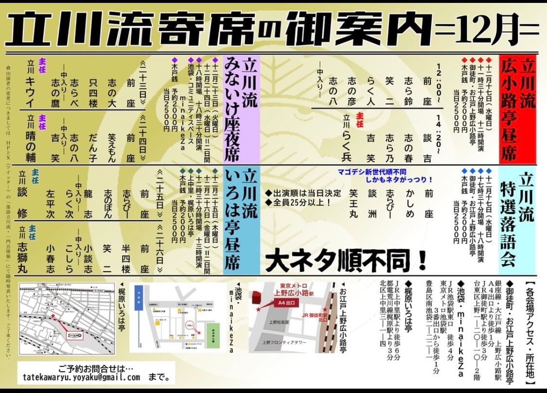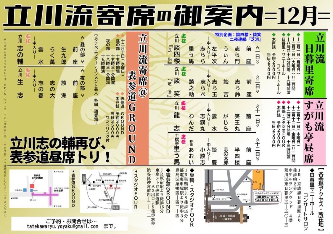 立川志の春独演会in柏 其の百十二 2024年3月16日 2024年3月16日(土)立川志の春独演会in柏 其の百十二 日付2024年3月16日(土) 場所柏・京北ホール 〒277-0005 千葉県柏市柏1丁目4−3−6階 時間14:30〜(開場:14:00) 出演立川志の春 料金料金 一般2,500円、学生1,500円 申込方法・Peatixからお申込み Peatix:https://kashiwa112.peatix.com/ 主催志の春事務局 Tweet Share Hatena Pocket RSS feedly Pin it